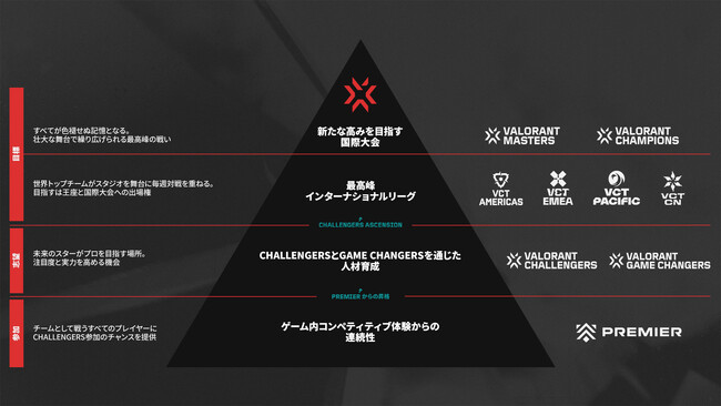 ChallengersとAscensionは、VCTの最高レベルに到達しようという意志を持つプレイヤーにその機会を提供することを目的として進化を続けます。Challengersは各地域のショーケース、すなわち世界中に広がる数多くのVALORANTコミュニティーから最強のプレイヤーが羽ばたくための舞台として機能することになります。