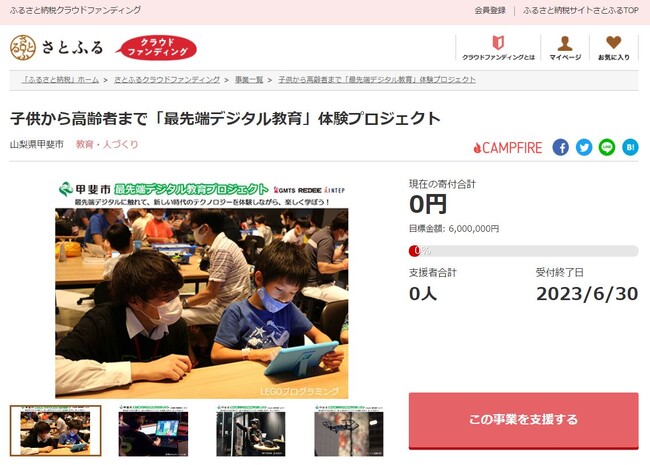 山梨県甲斐市とふるさと納税ポータルサイト「さとふる」(https://www.satofull.jp/)を運営する株式会社さとふる(本社:東京都中央区、代表取締役社長:藤井 宏明)は、寄付金の使途に応じて事業を立ち上げ寄付を募る「さとふるクラウドファンディング」(https://www.satofull.jp/projects/top.php)にて、デジタル教育への興味関心を醸成する体験イベントを開催するため、2023年4月21日より寄付受け付けを開始しました。