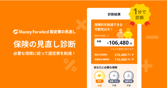 株式会社マネーフォワードは、本日より、家計の見直しサービス『マネーフォワード 固定費の見直し』において「保険の見直し」機能を提供開始しました。お金の見える化サービス『マネーフォワード ME』のデータをもとに、個人の資産や家計状況に合った必要保障額※1を把握できる独自の診断ツールも併せて提供開始します。