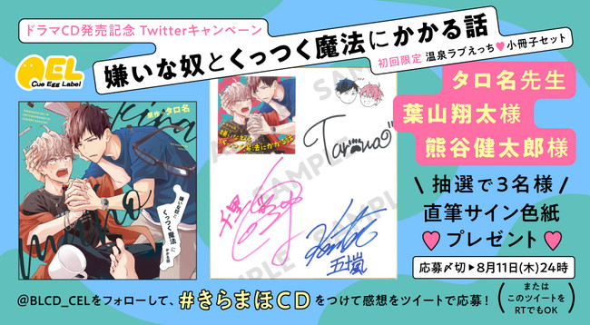 「嫌いな奴とくっつく魔法にかかる話」ドラマCD本日発売! タロ名先生・葉山翔太さん・熊谷健太郎さんの直筆サイン色紙が当たるTwitterキャンペーン開催中!