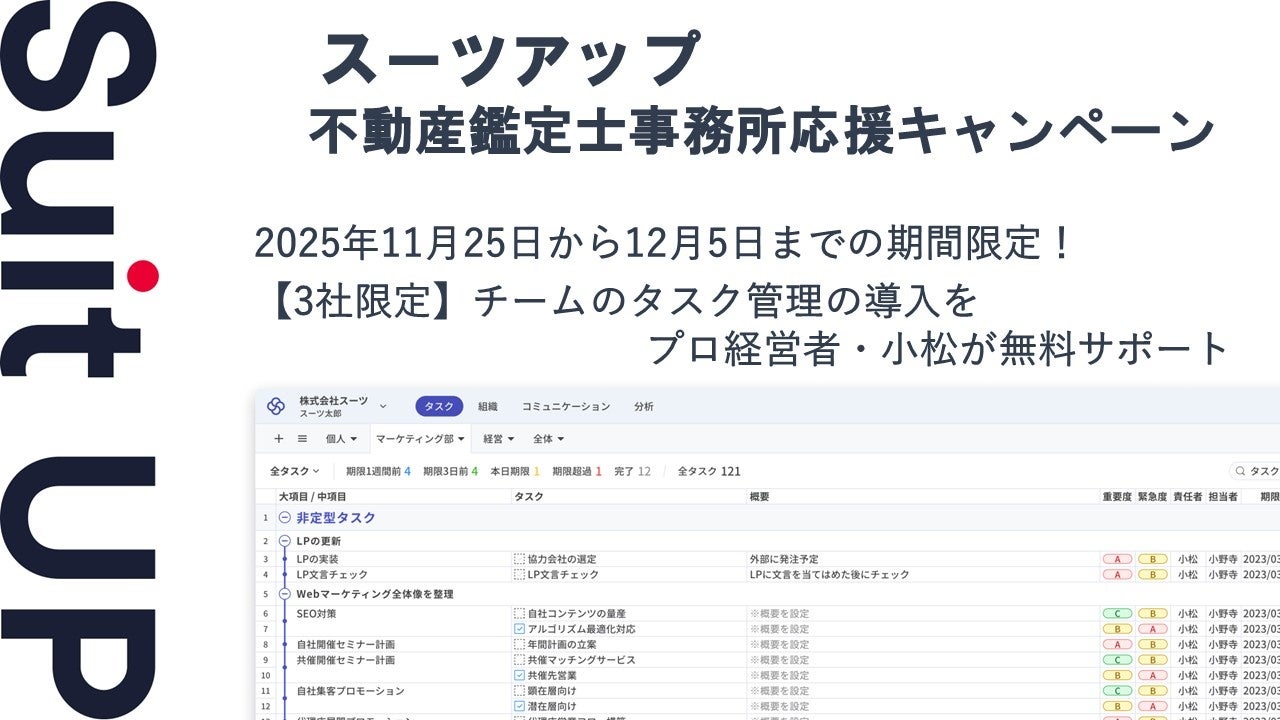 2025年11月25日から12月5日までの期間に、スーツアップの無料お試しにお申込みいただきました不動産鑑定士事務所でチームのタスク管理を導入する予定の事務所のうち3事務所限定で、当社代表者であり中小・中堅企業やスタートアップのバリューアップに実績のあるプロ経営者の小松自ら、チームのタスク管理の導入サポートを無料で行うキャンペーンを実施します。
