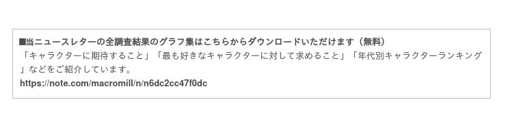 ※1:選択肢の抽出方法:定性調査ツール「ミルトーク」を使って、好きなキャラクターは何かを自由回答で尋ねた。1,065名から集まった自由回答のうち、票数が多かった上位20キャラクターを抽出。その上位20キャラクターを選択肢として、別途インターネットリサーチを実施。ミルトークでの調査期間は、2022年2月2日(水)〜2022年2月9日(水)。選択肢とした上位20キャラクターは以下。江戸川コナン、キキララ、鬼滅の刃、ぐでたま、くまのプーさん、くまモン、スヌーピー、すみっコぐらし、トトロ、ドナルドダック、ドラえもん、ハローキティ、ピカチュウ、ひこにゃん、ふなっしー、ミッキーマウス、ミッフィー、ミニオンズ、ムーミン、リラックマ/並びは五十音順