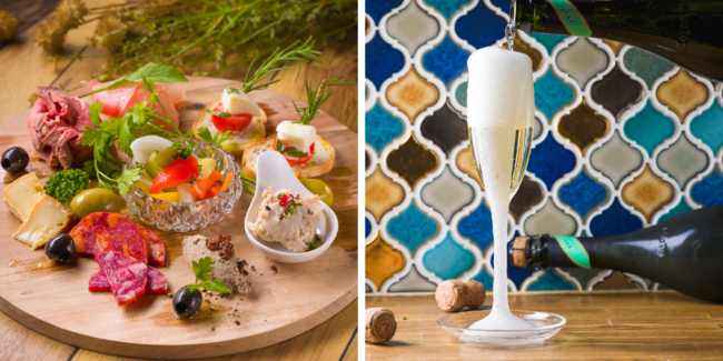 前菜は名物【なみなみスパークリングワイン】と一緒に