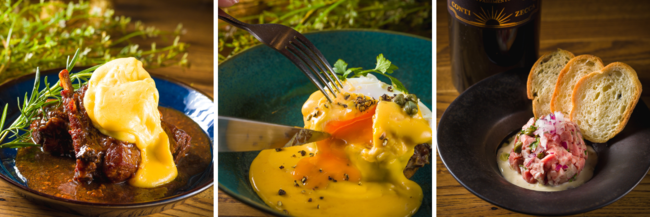 シェフ自慢の創作料理は、味も見た目も大満足のラインナップが勢ぞろいしました。ホロッと柔らかく煮込んだスペアリブに贅沢にチーズを流したとろ〜りチーズのスペアリブや、特製ソースと半熟卵を絡めて食べる厚切り牛タンのエッグベネディクトなど、千住MEATでしか味わえない逸品をぜひお試しください。