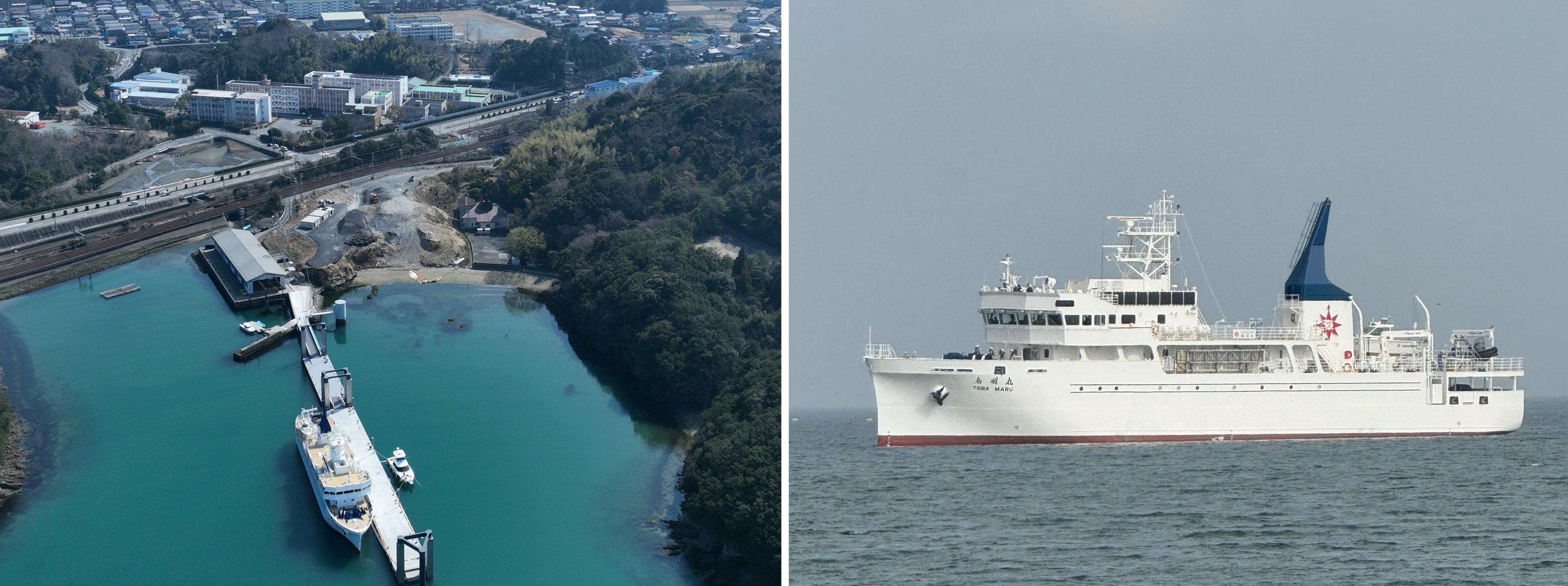 左写真|鳥羽商船高等専門学校の外観(奥側)・練習船が停泊する桟橋(手前側)、右写真|令和7年3月竣工の練習船鳥羽丸四代目