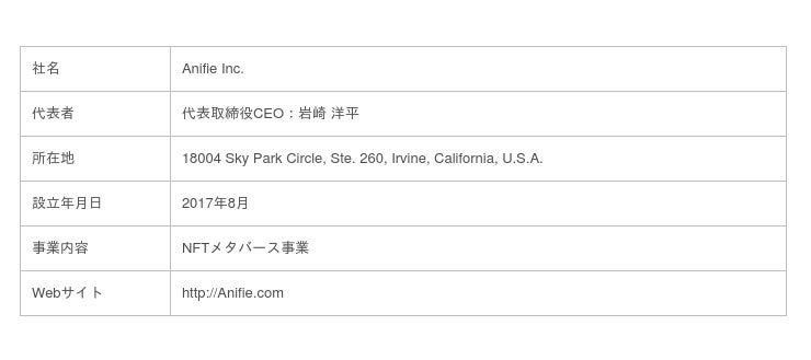 Anifieは、事業会社向けに、新たなコミュニケーション空間と経済圏であるメタバース(※1)とNFT(※2)の開発支援を提供する米国・カリフォルニアのスタートアップ企業です。日本人連続起業家の岩崎洋平氏が、グラミー賞受賞者ジョン・エッチェン氏や、セックス・アンド・ザ・シティの作曲家のパトリック・ウッドランド氏などとともに、NFTメタバース事業に取り組んでおり、スタンフォード大学のアクセラレータ、スタートXにも参加を認められているほか、米国で著名な投資家サンドヒル・エンジェルズからも投資を受けるなど、NFTメタバース分野での活躍を期待されています。