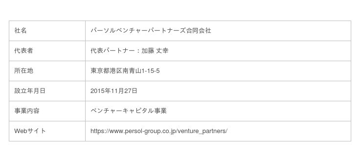 なお本出資は、パーソルベンチャーパートナーズ合同会社(本社:東京都港区、代表パートナー:加藤丈幸、旧PERSOL INNOVATION FUND合同会社)を通じて実施いたしました。