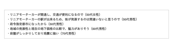 コメントを見てみると「リニアモーターカーの駅ができる」「政令指定都市になったが、まだ発展しそう」という内容が多かったです。