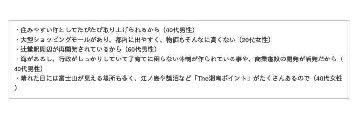 コメントを見てみると「辻堂周辺が再開発され活気がある」「住みやすい街として度々取り上げられている」「子育て制度が充実している」という内容が多かったです。