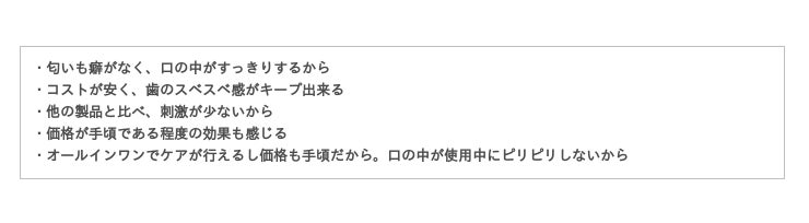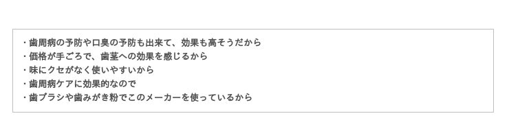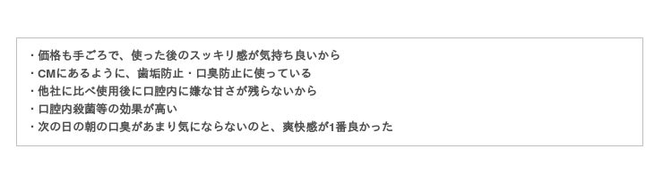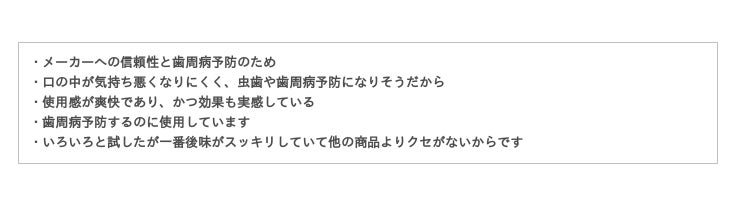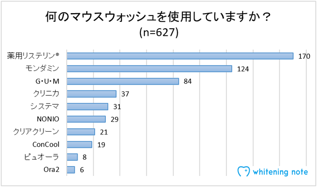 アンケートサイト「ボイスノート」にて、627人に現在使用しているマウスウォッシュを一つ、自由記述欄で回答していただきました。
