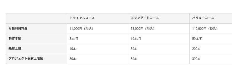月額1万円(税込11,000円)から利用でき、本数に応じて3つの定額コースを用意しています。初期費用や最低契約期間の制限も無く、個人事業主でも利用しやすいお手頃かつ明快な価格設定です。また、アカウント登録をするだけでテンプレート選択、動画作成からプレビュー確認までを無料で試すことができ、内容に納得した上で有料の月額プランに加入できるため、安心して始めていただけます。