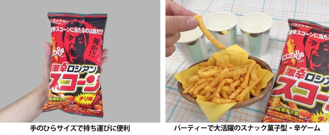 いつもの「スコーン」そのままに、お一人で辛体験に挑戦していただけるほか、ご家族やお友達との対戦プレイや協力プレイもお楽しみいただけます。人の集まる機会の多い年末年始にお届けするスナック菓子型・辛ゲーム「激辛ロシアンスコーン チリ味」をぜひプレイしてください。