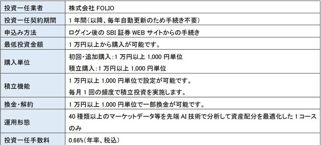 SBI 証券と FOLIO は、多様な投資一任サービスの提供を可能にするシステムプラットフォーム「4RAP」の特性 を活かし、FOLIO が培ってきた AI 運用ノウハウを活用した『AI×投資一任(ラップ)』という新しいジャンルの投 資一任サービスを提供しています。今後も、「顧客中心主義」のもと、長期の資産形成に資する投資一任サービ スを提供し、お客さまのニーズに合わせて資産形成を支援していきます。