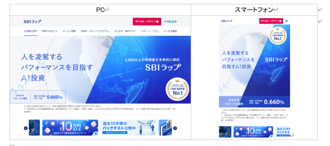 1周年に合わせて、よりSBIラップの魅力を伝えるべく「SBIラップ」サービスサイトを大幅リニューアルしました。プロの投資家(人)よりも高度な運用を実現するために「SBIラップ」のAI投資が目指すことや期待できることをよりわかりやすくご紹介していますので、この機会に是非ご覧ください。
