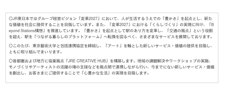 東京藝術大学は藝術・音楽などの分野における世界水準の教育研究活動を行っており、福祉や医療など藝術以外の分野においても社会連携活動を行うなどしております。また、JR東日本には「駅」「鉄道網」といったアセットがあり、多種多様なサービスの提供を行うノウハウを有しています。両者の強みを最大限掛け合わせて協業を図ることで、社会のさまざまな課題の解決に向けた取り組みを推進し、「心豊かな生活」の実現を目指します。