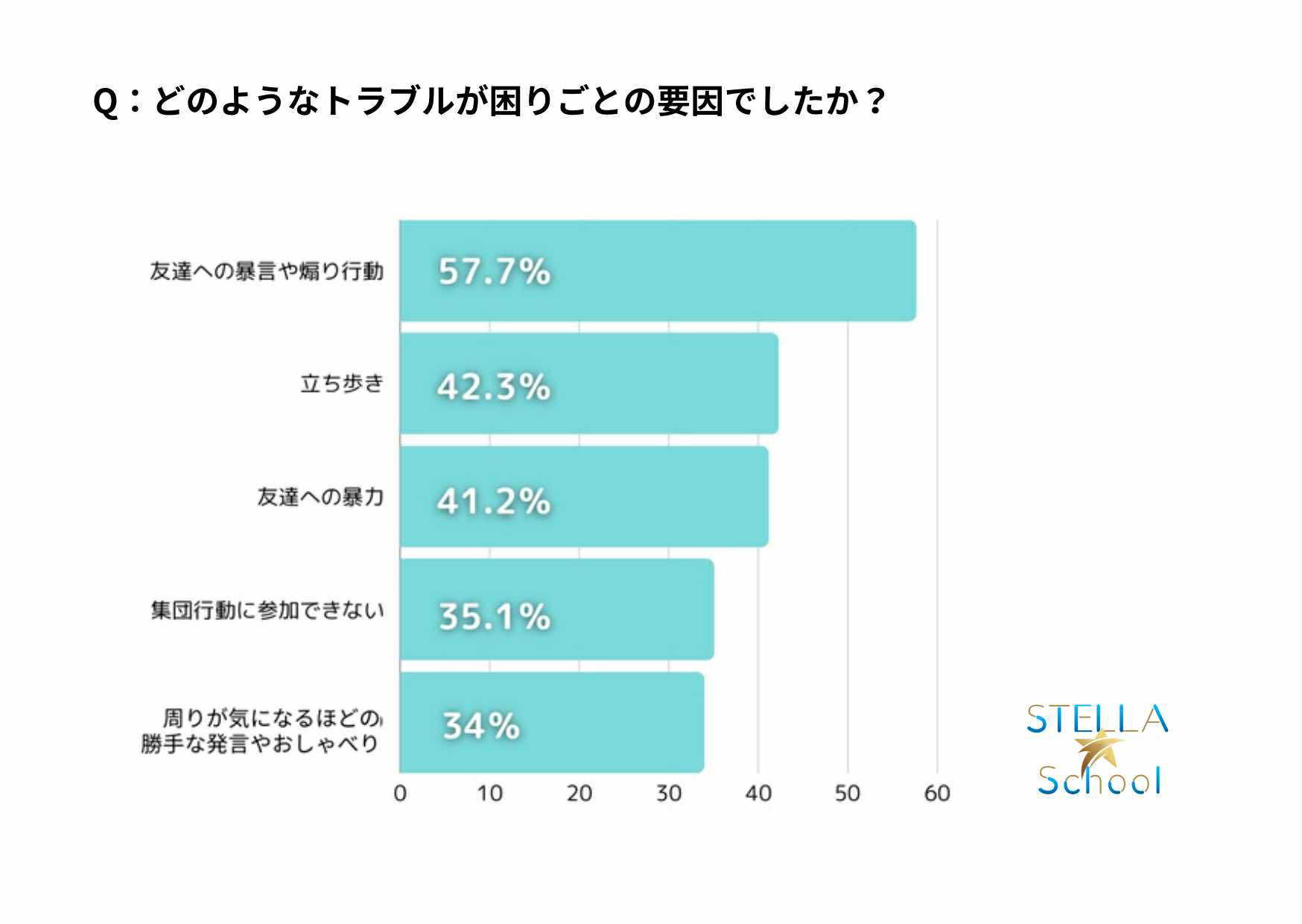 このアンケート結果からもわかるように、この時期お子さんが学校や園でトラブルを起こす事に悩んでいるママが多く、特に友達や先生への暴言暴力や授業中の立ち歩き、集団活動に参加できないという困りごとに直面している傾向があるのです。