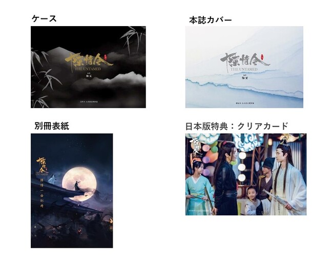 壮大な世界観の舞台裏をスタッフ・キャストのインタビューや美麗な写真、イラストと共に紹介。また五大世家の人物設定など余すことなく収録した豪華2冊組。魏無羨と藍忘機のはがきサイズクリアカード(1種)も封入。
