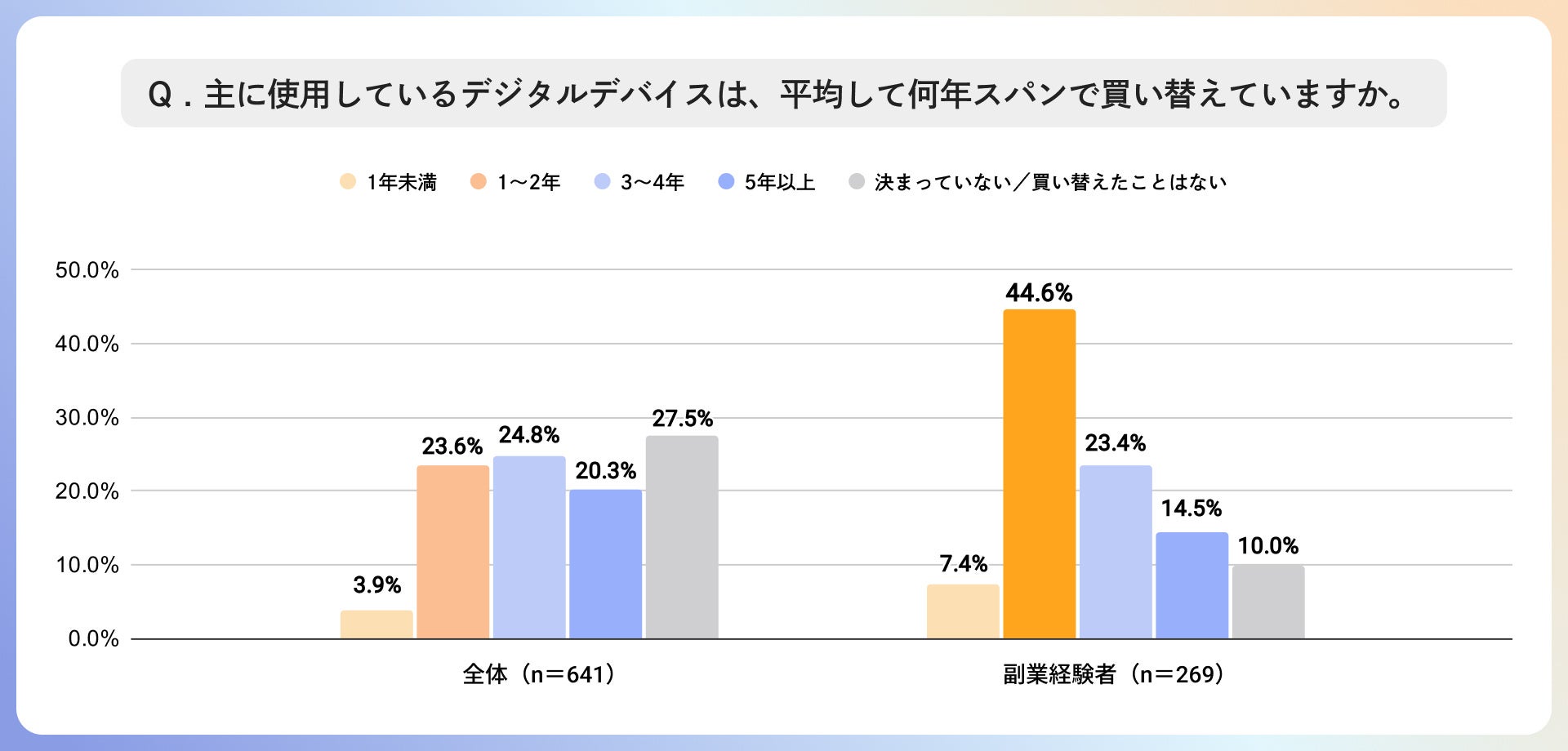 さらに、デジタルデバイスの買い替えスパンについては、全体では 「決まっていない/買い替えたことはない(27.5%)」 が最多で、次いで 「3〜4年(24.8%)」、「1〜2年(23.6%)」が続きましたが、副業経験者を見ると、「1〜2年(44.6%)」での買い替えが最多となり、全体よりも短いサイクルで積極的にデジタル環境をアップデートしていることが明らかになりました。