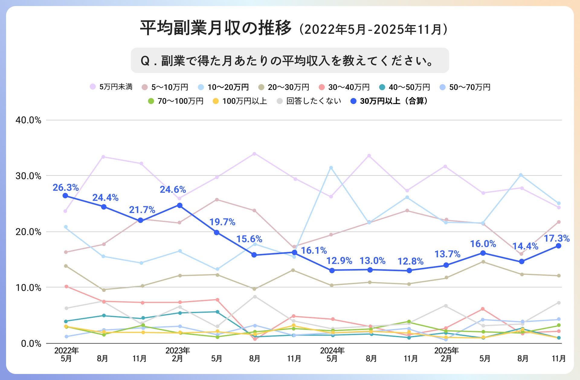 副業経験者を対象に、副業で得た月あたりの平均収入について尋ねたところ、「30万円以上」と回答した人の割合が前回調査(2025年8月)から2.9ポイント、前年同月(2024年11月)から4.5ポイントそれぞれ増加しました。経営企画などの職種での副業実施率増加も見られたことから、スキルを活かした専門性の高い副業が広がっている可能性が示唆されています。