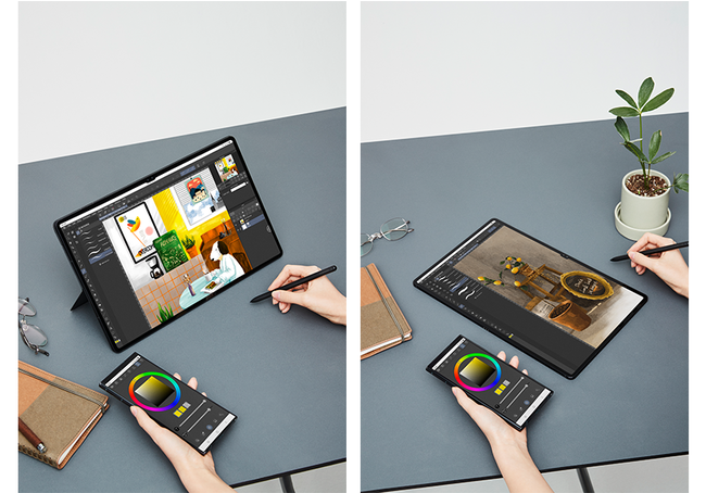 また、Galaxy Storeでは新機能「コンパニオンモード」を搭載したCLIP STUDIO PAINTが配信されており、本日発売の「Galaxy S22 Ultra/S22」などのGalaxyスマートフォンにCLIP STUDIO PAINTをインストールして、コンパニオンモードを使用できます。Galaxy Tab S8シリーズにWi-Fiで接続して、スマートフォンをパレットのように使い、CLIP STUDIO PAINTの色やブラシを選択し、Galaxy Tab S8シリーズ をデジタルキャンバスとして使用できます。Galaxy Tab S8シリーズとコンパニオンモードを組み合わせることで、快適で効率の良い作品制作を行っていただけます。