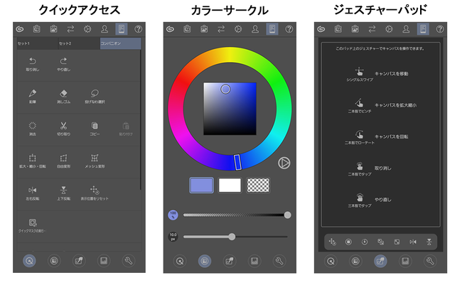 コンパニオンモードでスマートフォンにクイックアクセスを設定して、素早くツールを切り替えたり、カラーホイールを表示させることができるため、パレットを手元に置きながら、大きなディスプレイをキャンバスに見立てて、作品制作を快適に効率よく行うことができます。