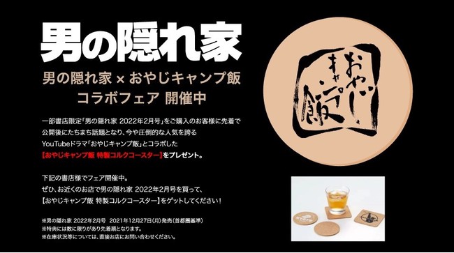 一部書店限定「男の隠れ家 2022年2月号」をご購入のお客様に先着で公開後にたちまち話題となり、今や圧倒的な人気を誇るYouTubeドラマ「おやじキャンプ飯」とコラボした【おやじキャンプ飯 特製コルクコースター】をプレゼント。ぜひ、お近くのお店で男の隠れ家 2022年2月号を買って、【おやじキャンプ飯 特製コルクコースター】をゲットしてください!