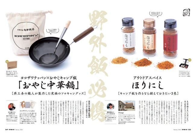 「おやじキャンプ飯」の両誌指導をした岡山恒太郎が考案したキャンプ飯レシピ12。ヨコザワテッパンとおやじキャンプ飯がコラボした中華鍋と、アウトドアショップOrangeが生み出した3種のアウトドアスパイス「ほりにし」を全て使った料理に編集部が挑戦した。