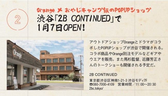 アウトドアショップOrengeとドラマがコラボしたPOP UPショップが1月7日(金)に渋谷で開催される。コラボ商品やOrengeべ中モデルなどギアやウエアを販売。また馬杉 監督、近藤 芳正さんのトークショーも開催予定。