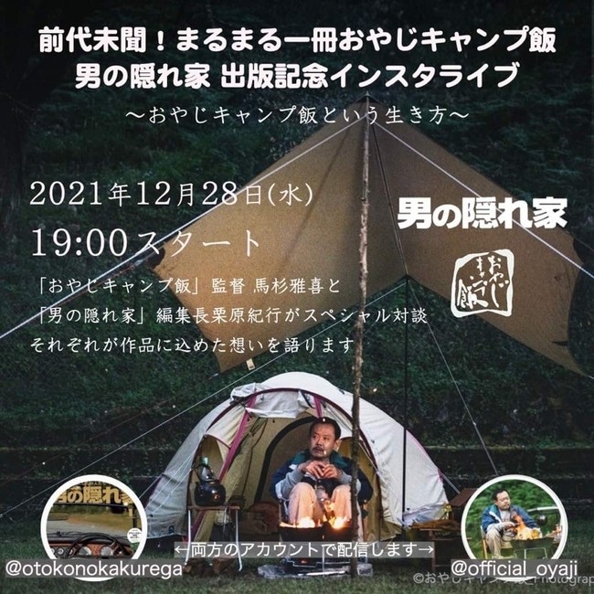 「おやじキャンプ飯」の第二弾[和歌山編]公開と、「おやじキャンプ飯」の大特集「男の隠れ家 2022年2月号」発売を記念して、「おやじキャンプ飯」馬杉雅喜監督と「男の隠れ家」編集長が、東西のキャンプ場からインスタライブ コラボ配信を開催します!「おやじキャンプ飯」和歌山編の撮影秘話はもちろん、今まで語られなかったことや今後の展望、そして丸々1冊「おやじキャンプ飯」特集「男の隠れ家」制作裏話などを語り尽くす1時間。年末のひと時、「おやじキャンプ飯」の新たなスタートに皆で乾杯いたしましょう!事前の質問なども受け付け中です!