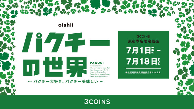 あなたの“ちょっと幸せ”をお手伝いする雑貨ブランド「3COINS」(スリーコインズ)は「3COINS原宿本店」にて、ポップアップイベント「パクチーの世界」を2022年7月1日(金)から7月18日(月・祝)迄開催します。