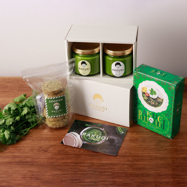 ・パク束(324円)・パクチーペーストBasic(1,620円)・パクチーペーストCheeseless(1,620円)・パクチーグリーンカレー(1,188円)・パクチークッキー(540円)・パクチースノーボール(540円)