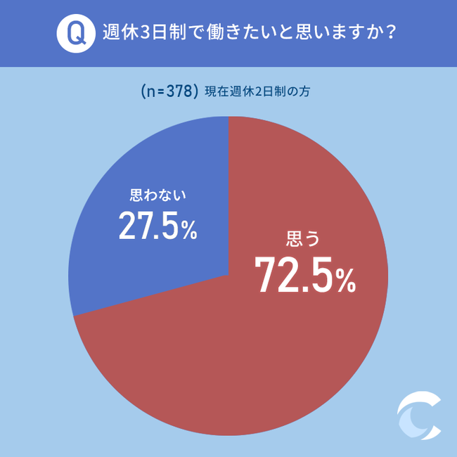72.5%の方が「週休3日制で働きたいと思う」と回答しました。