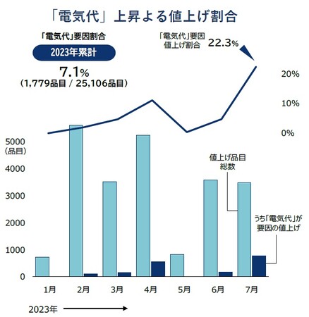 2023年2月以降、電気代の上昇を理由とした値上げの割合が高まり、5000品目を超えた4月は約1割を占めた。7月には値上げが予定されている約3400品目のうち、2割を超える777品目が電気代の上昇を値上げの理由とした。年後半にかけて、値上げ理由に占める「電気代」の割合が高まる可能性がある。