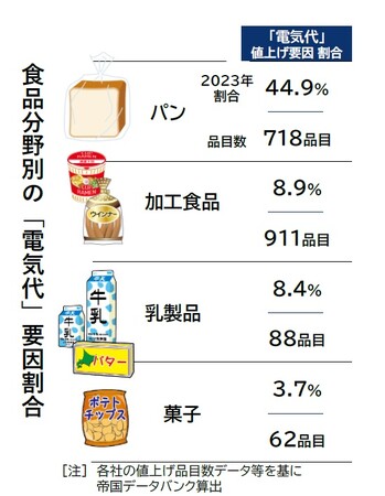 主な食品分野別にみると、電気代を理由とした値上げの割合が最も高いのは「パン」で、全約1700品目のうち約4割・718品目で判明した。パン製品は、オーブンでの焼き上げや発酵を促すための温度管理など、製造工程の多くで電力を大量消費する食品分野の一つとなる。輸入小麦の価格改定に伴う小麦粉価格の値上げに加え、バターなどの乳製品やイースト、砂糖、各種油脂製品など原材料価格が大幅に引き上げられるなか、電気代の上昇分を経営努力で吸収できる余力に乏しいことも要因とみられる。