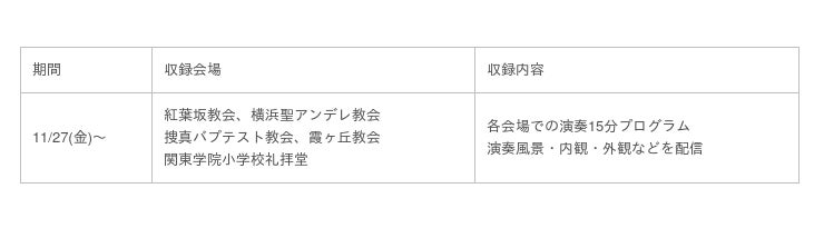 この3つの日本製パイプオルガンに紅葉坂教会(西区)、横浜聖アンデレ教会(神奈川区)のオルガンを加えて、その音色を11月27日より配信いたします。