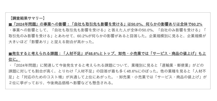 今回の調査からは、特に中小企業において取り組みや課題意識が進んでいないことが明らかになりました。法対応を急ぐ企業では、労働時間の「上限規制」や「管理の厳格化」が進められる傾向が見て取れますが、デジタル活用や労働条件改善、宅配/配送方法の見直しなどの抜本的な対策がなされなければ、時間外労働の上限規制はサービス残業化や名ばかり管理職など、多くの「抜け道」を生むことにもつながりかねません。この問題は、サプライチェーンの停滞やコスト上昇などを通じ、多くの産業に影響を与えるものであり、業界全体を上げた対策が急務です。