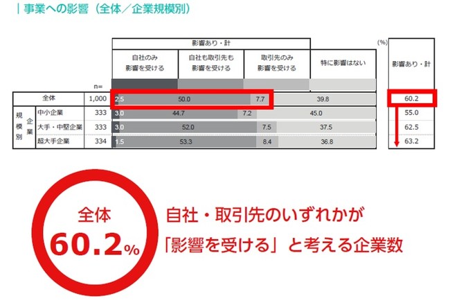 事業への影響として、「自社も取引先も影響を受ける」と答えた人が全体の50.0%、「自社のみ影響を受ける」「取引先のみ影響を受ける」とあわせて、60.2%が何らかの影響があると回答した。企業規模別に見ると、企業規模が大きいほど「影響あり」と捉える割合が高かった。