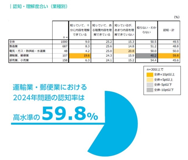 業種別に見ると、「2024年問題」の影響を直接受けやすい「運輸業・郵便業」は2024年問題に対する「認知・計」が59.8%、そのうち「知っていて、十分に内容を理解できている」人は19.6%と他業種よりかなり高く、問題認識が高いことがうかがわれる。一方、間接的に影響を受けるその他の業種では認知率が50%以下となった。