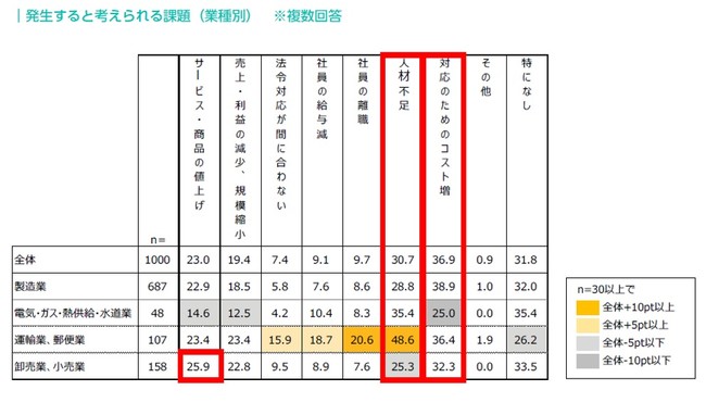 「2024年問題」に関連して今後発生すると考えられる課題について、業種別に見ると「運輸業・郵便業」がどの課題に対しても割合が高く、とりわけ「人材不足」の回答が最も多く48.6%にのぼった。また、他の業種を見ると「人材不足」と「対応のためのコスト増」が共通して上位にあがった。卸売業・小売業では「サービス・商品の値上げ」が2位に挙がっており、今後商品価格へ影響なども懸念される。