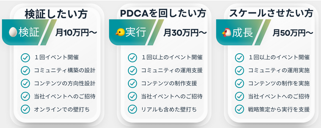 月額10万円〜/月1イベント〜/限定3社: B2B営業に寄与するイベント開催・コミュニティ構築支援。メディア支援数50以上、数千人のコミュニティ構築実績をもとにサポート。このプランでは、限定3社の企業に対して、ターゲットとなる顧客を集めたイベントの企画・運営や、B2B営業に特化したコミュニティの構築・運営を支援します。