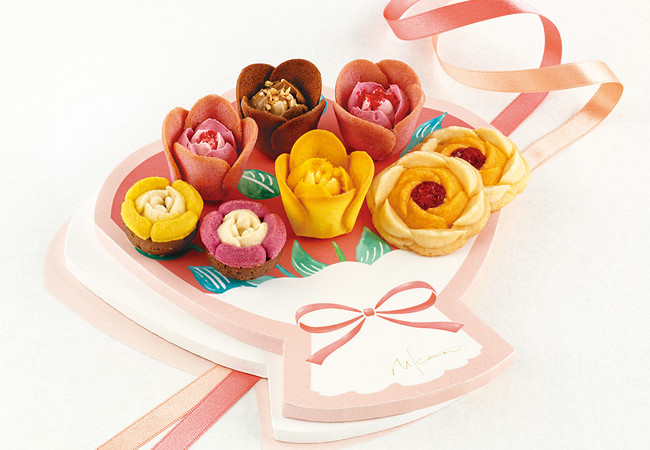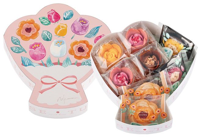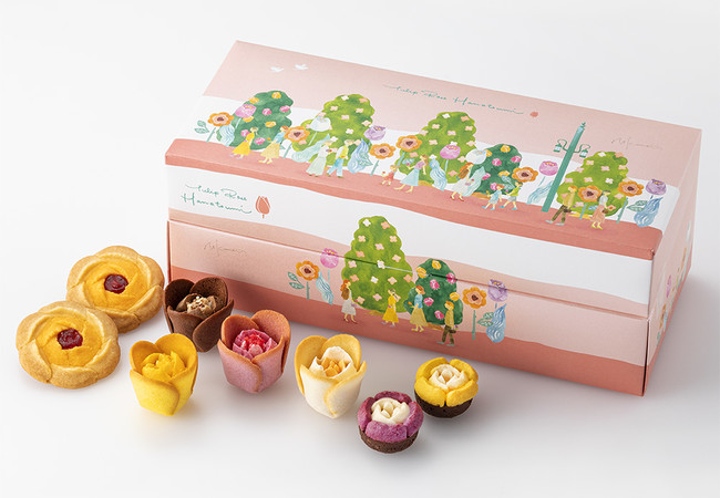 お花のスイーツがあふれだす2段重ねの豪華なボックスは、お花が咲きほこった春のチューリップタウンの街角を行き交う人々を描いた限定デザイン。こうばしい香りあふれる季節限定「チューリップローズ チーズ」をはじめ、7種のお花が楽しめる詰合せで登場します。ぽかぽか陽気でたのしむ春のパーティーや、大好きなお母さんへ笑顔を届けるサプライズギフトに!