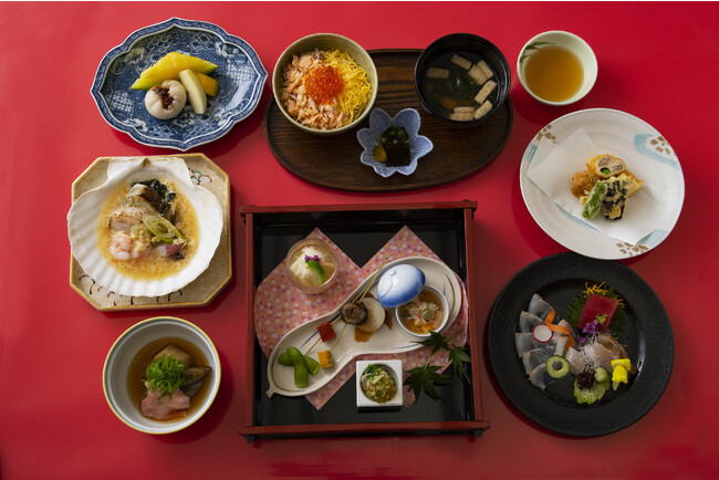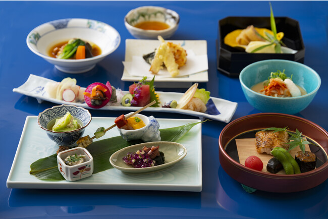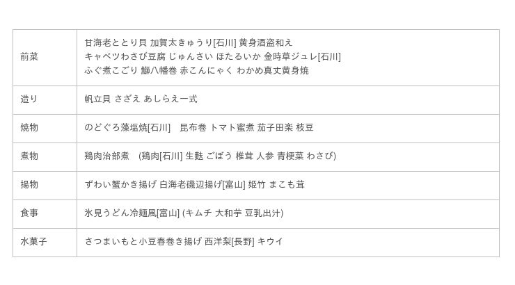 加賀太きゅうりや金時草といった加賀野菜を使用した前菜や、富山湾でとれた白海老のかき揚げ、富山のご当地グルメ「氷見うどん」をまろやかな豆乳出汁を合わせ冷麺風にアレンジした食事など北陸地方の魅力を盛り込んだ充実のコースです。
