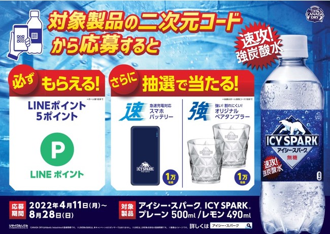 パッケージデザインリニューアル新発売にともない、4月11日(月)から開始するプレゼントキャンペーンでは、期間中、対象製品のラベルに記載の二次元コードをスマートフォンで読み込むと、LINEポイントが必ずもらえたり※2、“速攻!強炭酸水”をイメージしたグッズが抽選で当たります※3。さらにコカ・コーラ公式スマートフォンアプリ「Coke ON」対応自動販売機での購入で「Coke ON」スタンプが2倍になるダブルスタンプキャンペーン※4、「アイシー・スパーク」をプレゼントするTwitterキャンペーンも実施します。