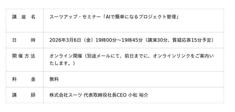 当社では、2026年3月6日(金)19時から、当社代表の小松が講師を務めるスーツアップ・セミナー「AIで簡単になるプロジェクト管理」を無料開催します。