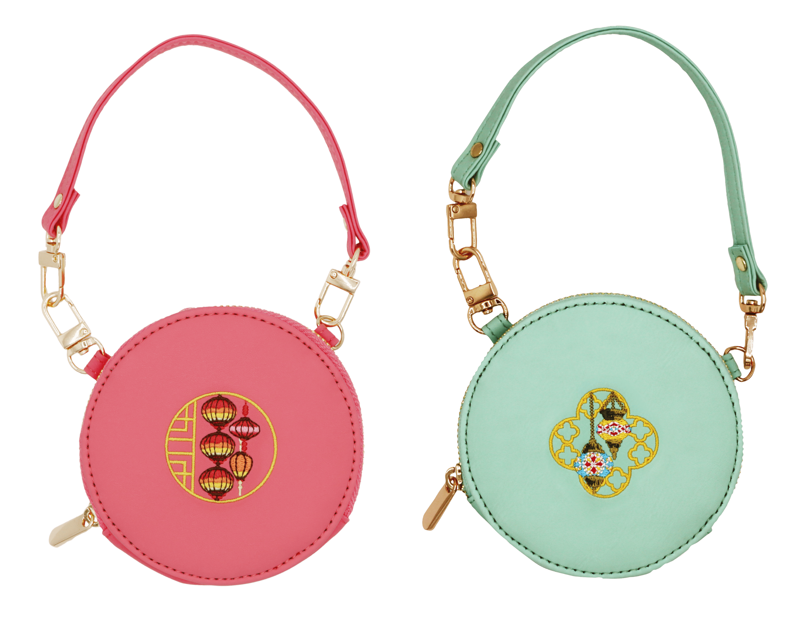 ・コロンと丸い形に、刺繍でランタンのデザインを施した丸型ポーチは、ストラップつきで