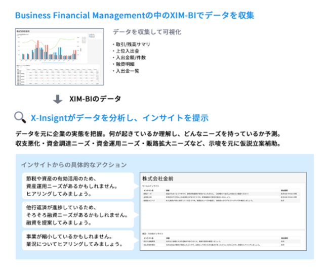 本日より提供を開始する「インサイト機能」は、「XIM-BI」によって可視化された法人顧客の入出金情報や取引情報を、さらにデータ分析基盤「X-Insight」によって分析する機能です。「X-Insight」で法人顧客の実態を把握し、資金調達や資産運用ニーズなどのインサイトを得たうえで、金融機関の営業担当向けに融資提案や販路拡大につながる下図のような具体的なアクションの提案を行います。金融機関の営業担当者は、100社以上を担当することも珍しくなく、これまでは把握しきれなかった法人顧客に対しても「インサイト機能」によって迅速かつ適切な提案を行うことが可能になります。そのため「インサイト機能」は、金融機関のコンサルティング機能の強化および業務効率化に寄与し、収支改善に貢献します。