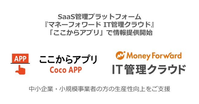 マネーフォワードi株式会社は、SaaS管理プラットフォーム『マネーフォワード IT管理クラウド』において、独立行政法人 中小企業基盤整備機構が提供する中小企業・小規模事業者の生産性向上に関する情報発信サイト「ここからアプリ」での情報提供を開始しました。