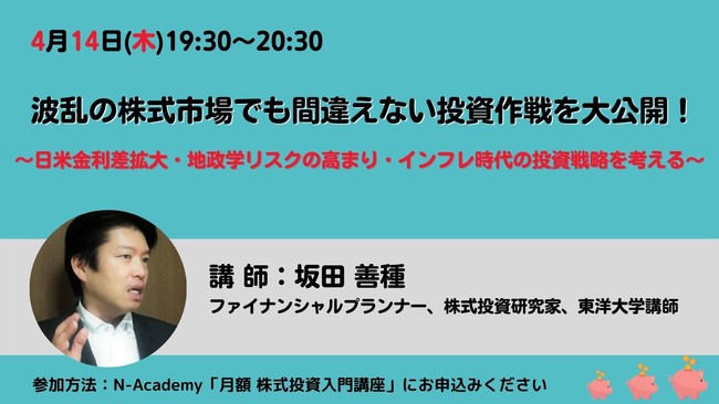 株式会社デジタル・ナレッジが運営する、会員数23万人超を誇るネットスクール「N-Academy(エヌ・アカデミー)」は、株式投資をやってみたい方、投資初心者の方に人気の「月額 初歩からわかる株式投資入門講座」にて、旬の情報をお届けするオンライン配信セミナー『波乱の株式市場でも間違えない投資作戦を大公開!〜日米金利差拡大・地政学リスクの高まり・インフレ時代の投資戦略を考える〜』を2022年4月14日(木)19:30から開催いたします。本セミナーは「月額 初歩からわかる株式投資入門講座」にお申込みいただいた皆様に公開いたします。