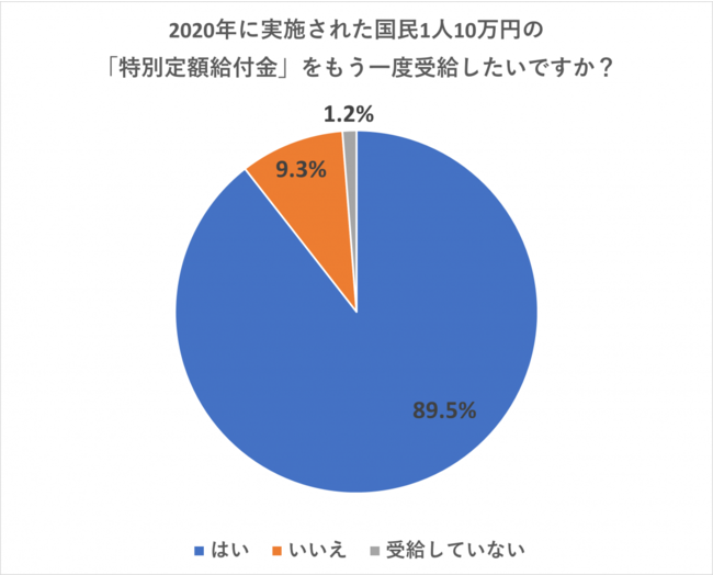 この一律10万円の給付金をもう一度受給したいと答えた方は全体の約90%でした。