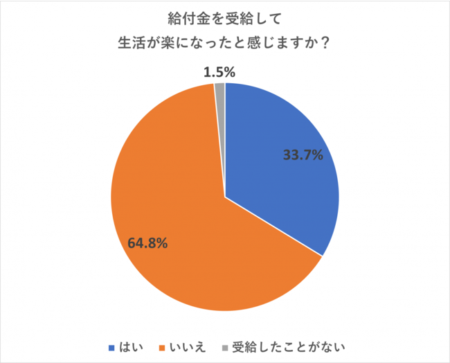 約65%ほどの方が「給付金を受給しても生活は楽になっていない」と答えました。